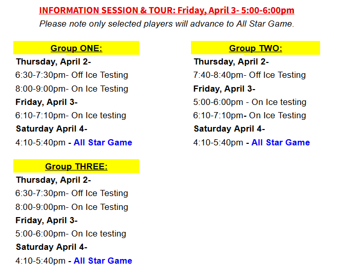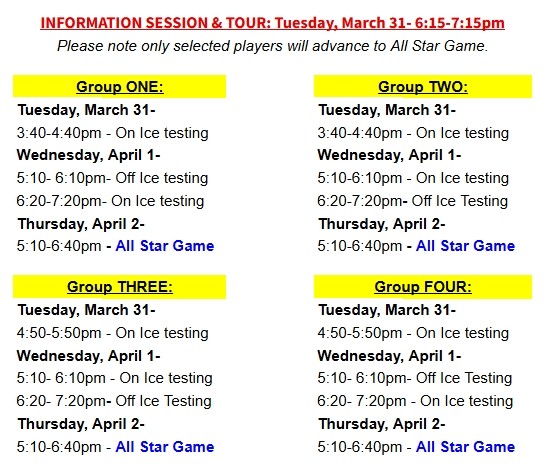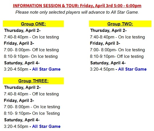 Okanagan Hockey Colorado Tryouts will begin March 31st through April 4th. The tryout process will include two on-ice sessions, one off-ice testing session, an OHC information session with a facility tour, and will conclude with an exciting All-Star Game for selected players.